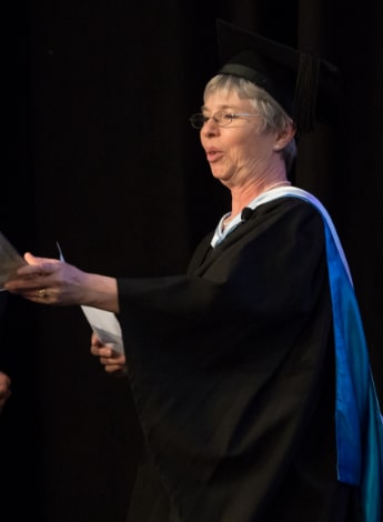 Barby Singer presents a certificate of graduation at the 2017 College graduation ceremony.