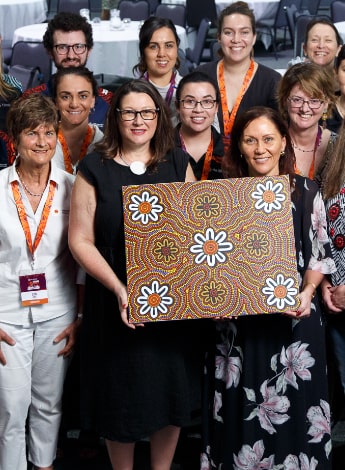 The IAHA board, with Occupational Therapy Australia members at the 2019 IAHA national conference, is presented with an original painting of the IAHA logo as a gift for reconciliation and building partnerships.