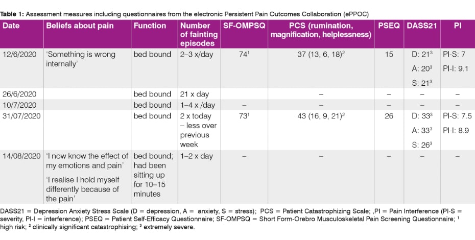 Tamsin had recently started seeing a clinical psychologist (two visits). Pain interference, emotional distress, catastrophising, and self-efficacy, assessed using outcomes from the electronic Persistent Pain Outcomes Collaboration (ePPOC), placed her in severe/high risk categories.