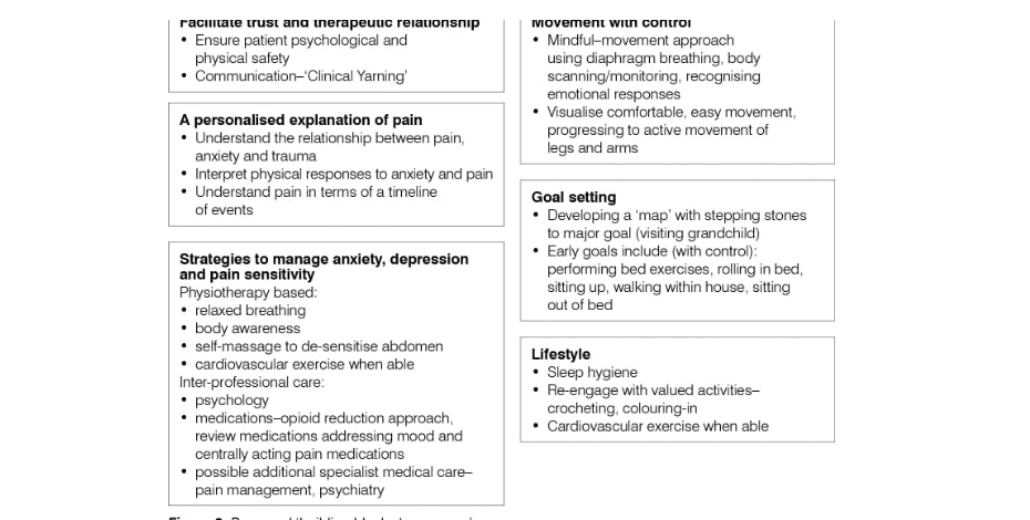The rationale of adopting a slow, cautious approach was taken because of Tamsin’s fear of physiotherapy, the need to ensure client physical and psychological safety (Kezelman & Stavropoulos 2019), the time required to develop trust and a strong therapeutic relationship, and to avoid aggravating pain given her high levels of pain sensitivity (Beales et al 2020).
