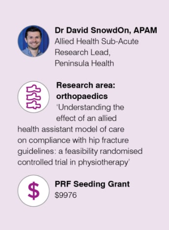 When conducting his PhD three years ago, Dr David Snowdon investigated the impact of elevating junior physiotherapists to improve patient outcomes after hip surgery. Here, the 2020 PRF Seeding Grant recipient discusses his research project.