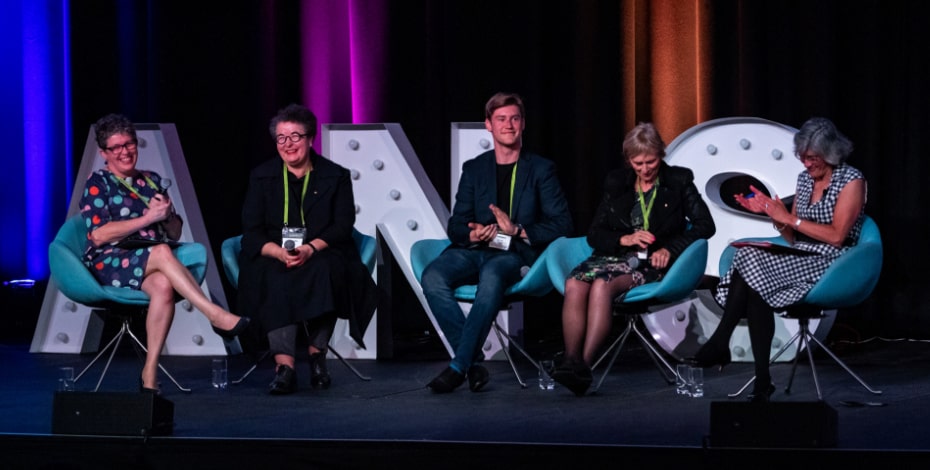 In plenary two, Professor Joanne Connaughton, APAM, led a discussion with APA Honoured Members Melissa Locke and Gillian Webb, academic clinical and health psychologist Jane Fisher, and Ryan Ebert, APAM.