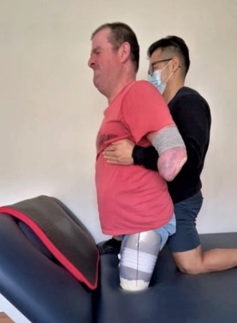 Jeremy, who is a Master of Research candidate at Macquarie University, researching physiotherapy care for individuals with limb loss, says that once the restrictions on Mick’s shoulder movements lessened, the focus could then shift to physiotherapy interventions that incorporated shoulder function while priming Mick’s trunk muscles to enable him to bring himself out of a lying position into a sitting position.
