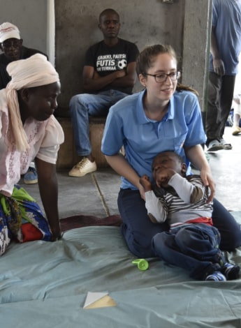 Caitlin Lloyd works with one of the very many young patients who travelled great distances to see the Australian volunteers.