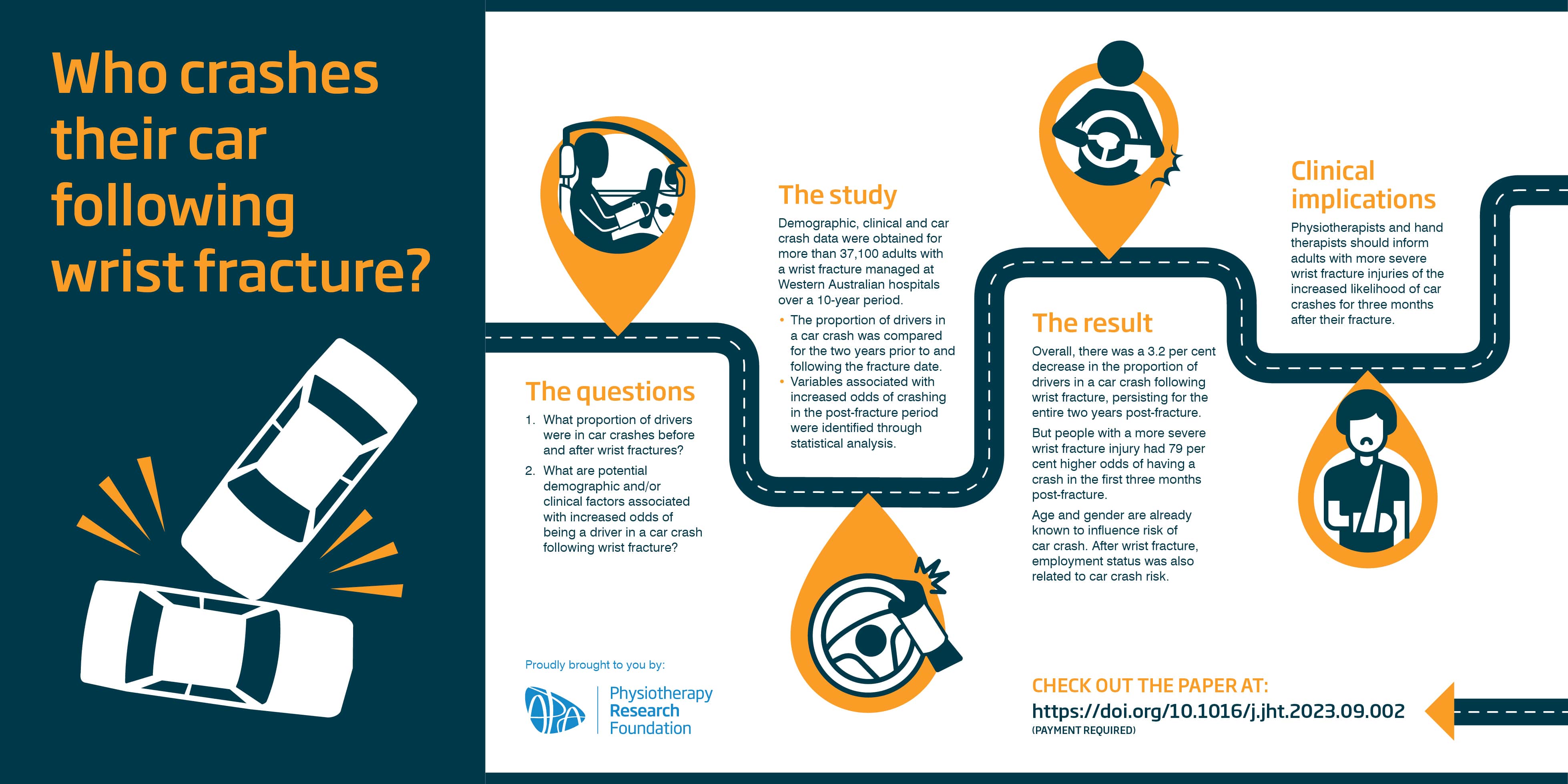 A team of researchers in Western Australia has linked demographic, clinical and car crash information to look at whether drivers were more likely to have a car accident following wrist fracture. Lead researcher Susie Stinton talks about the results of a Physiotherapy Research Foundation Seeding Grant study. The Physiotherapy Research Foundation (PRF) has summarised key messages from the research study’s findings featured in the March edition of InMotion and produced this infographic.