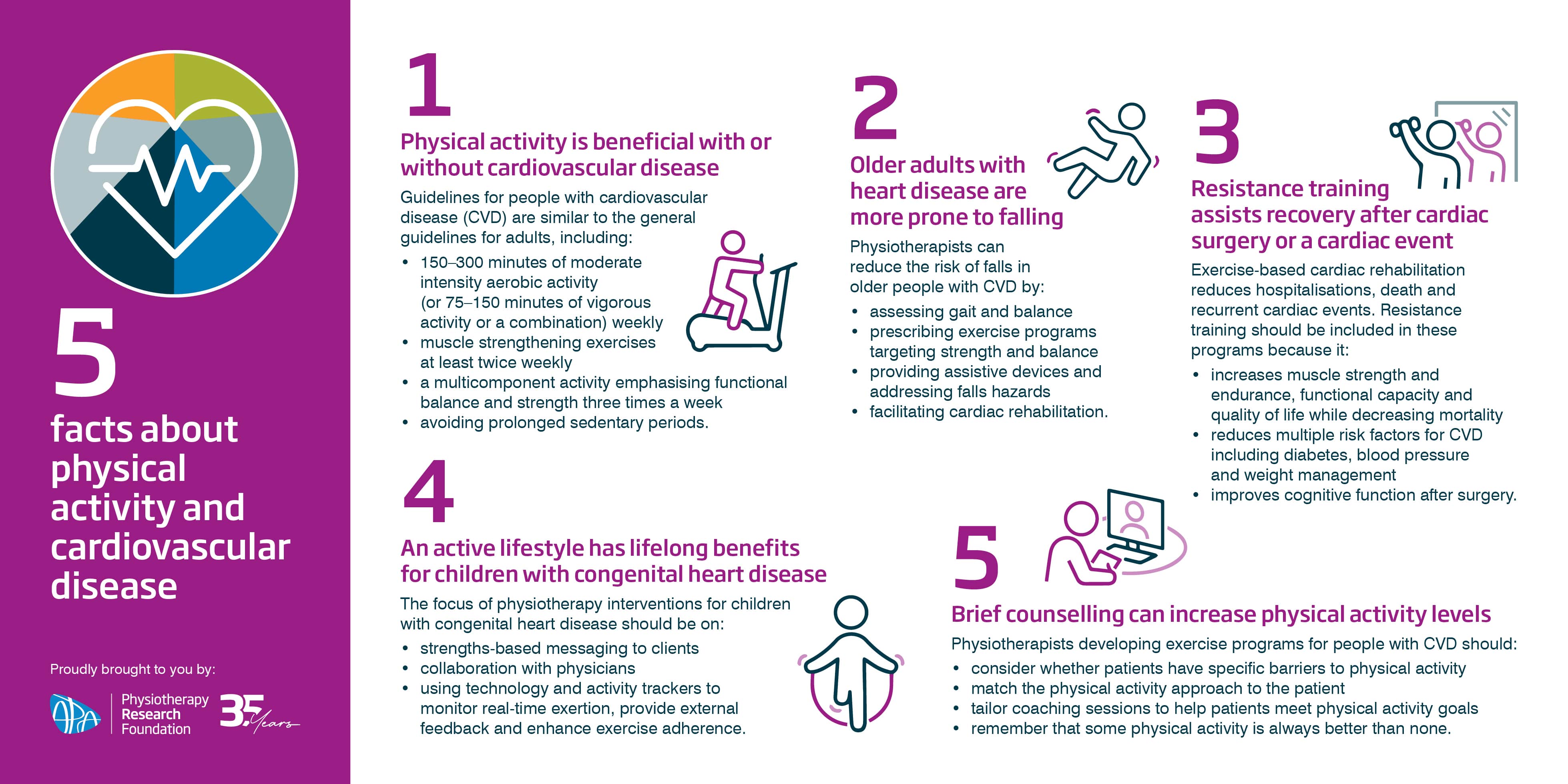 Physical activity provides significant health benefits with or without cardiovascular disease, and the guidelines for people with cardiovascular disease (CVD) are similar to the general guidelines for adults. Physical exercise for those with CVD also helps reduce the risk of falls in older people and reduces hospitalisations and recurrent cardiac events. Physiotherapists need to be aware of any specific barriers to physical activity, but remember that some activity is always better than none.