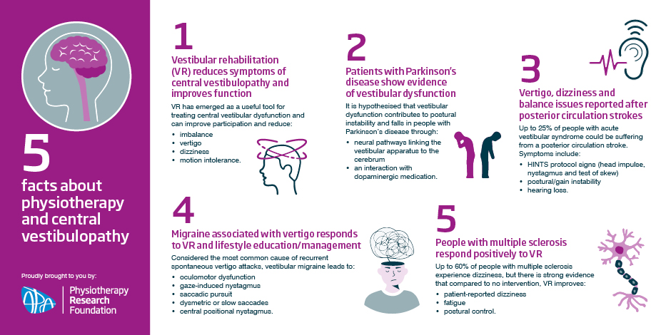 Central vestibulopathy can interfere with a patient's gaze stability and postural stability and cause dizziness. A useful tool in treating central vestibular dysfunction is vestibular rehabilitation (VR), a patient-centred physical therapy that reduces imbalance, vertigo, dizziness and motion intolerances.