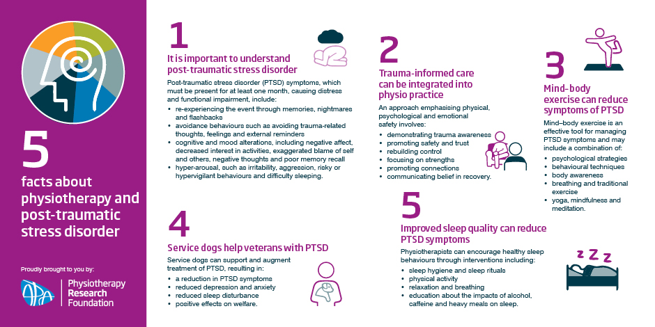 Post-traumatic stress disorder (PTSD) is associated with multiple emotions, such as guilt, shame, anger, fear and anxiety. Physiotherapy can play a part in recovery from PTSD through physical activity and exercise prescription, and facilitation of mind-body awareness.